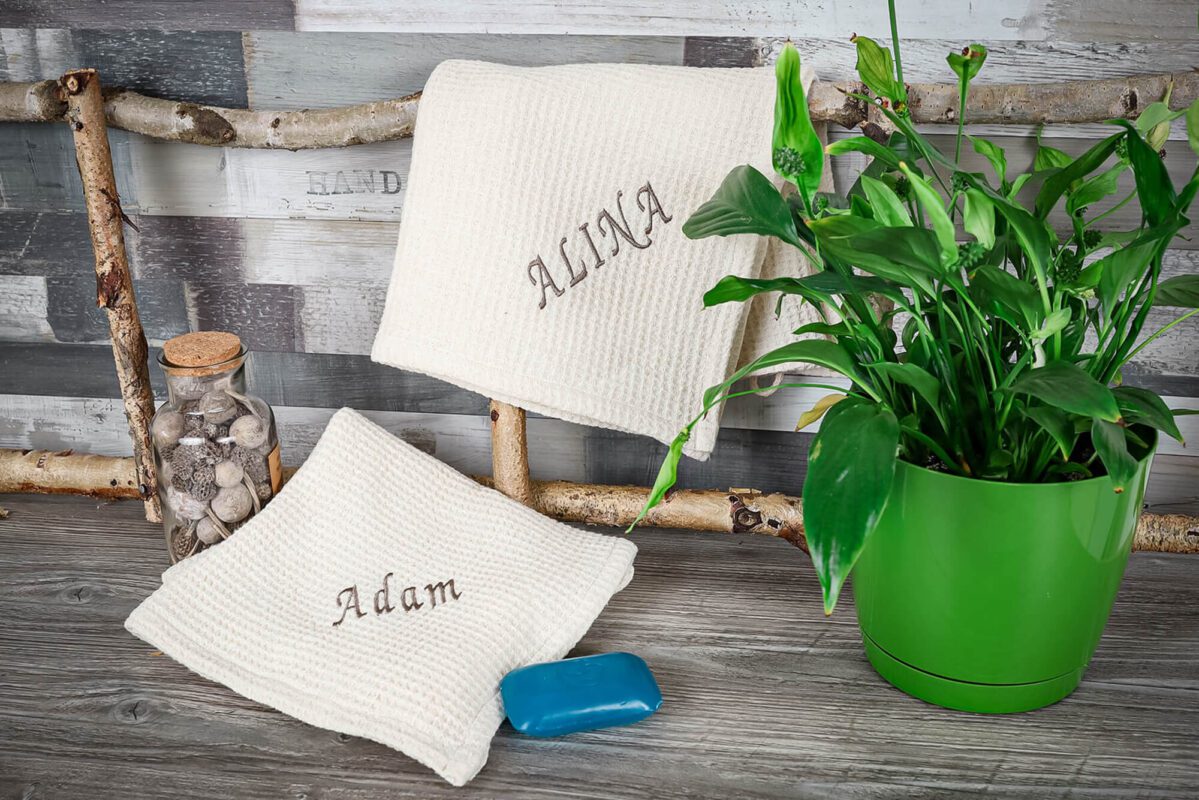 Personalizowane ręczniki lniane z miękkiego lnianego wafla są delikatny dla skóry i bardzo dobrze chłoną wodę. Ręcznik lniany szybko wysycha i nie zajmuje dużo miejsca, dlatego świetnie sprawdzi się nie tylko w domu, ale również na wyjazdach.