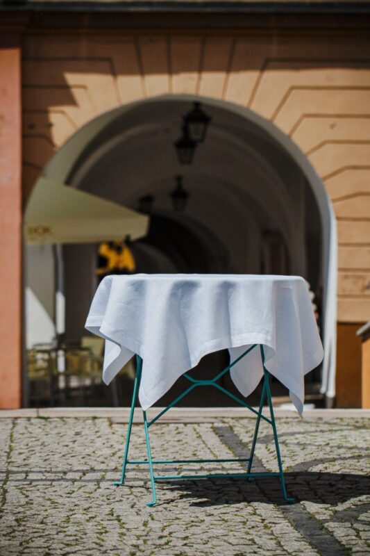 Przykładowo: nasz stół w jadalni ma wymiary 120×120 cm. Obrus, który będzie na niego idealnie pasował to wyrób o wymiarach 170×170 cm – w tym przypadku uzyskamy dłuższy zwis 25 cm. Jeżeli szukamy obrusu na stół z okrągłym blatem, musimy wykonać analogiczne obliczenia: na stół o średnicy 100 cm należy zakupić obrus o średnicy o 40-50 cm dłuższej (zwis wyniesie wówczas 20-25 cm z każdej strony). Obrus lniany takiej wielkości znakomicie się układa. Z kolei dłuższa tkanina źle wpływa na prezentację i zwiększa ryzyko pociągnięcia obrusu podczas wstawania od stołu. Pamiętajmy, że na niskie ławy wybieramy obrusy tylko niewiele dłuższe. Tak, aby materiał zwisający poniżej blatu nie sięgał zbyt nisko.