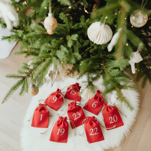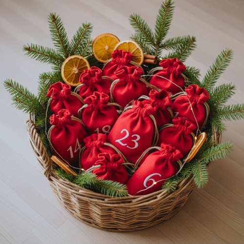 Rozsyp woreczki wokół choinki lub ukryj je między prezentami, ozdobami i gałązkami świerku – tak, by każdego dnia odkrywanie kolejnego numeru stało się częścią świątecznej zabawy.