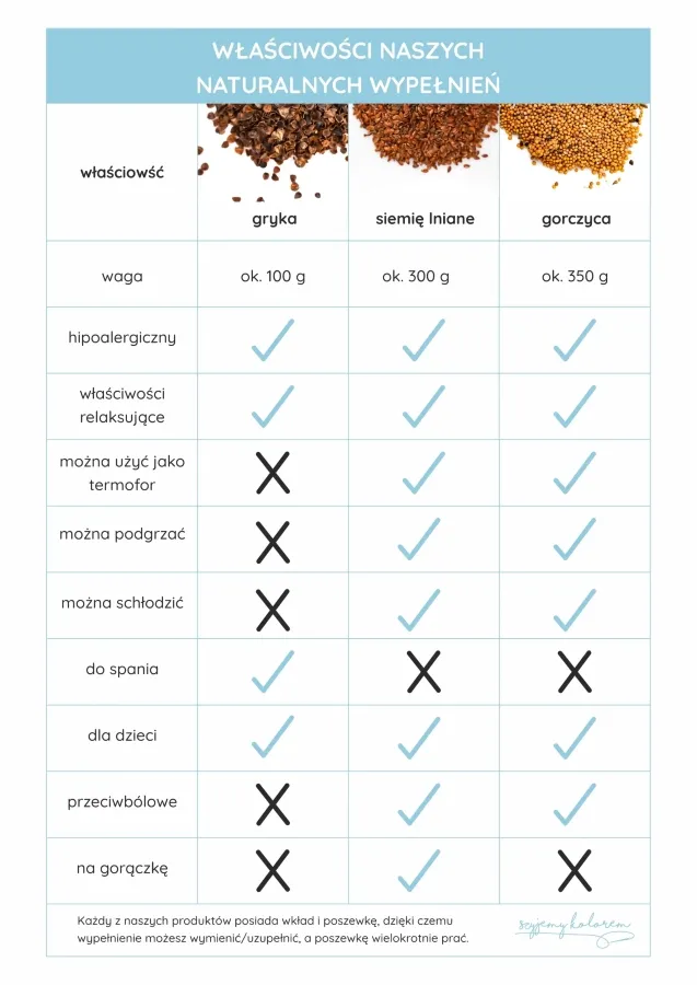Nasiona gorczycy są drobne, zwarte i cięższe, dzięki czemu bardzo dobrze kumulują temperaturę i oddają ją stopniowo. To właśnie ta cecha sprawia, że poduszeczka z gorczycą doskonale sprawdza się jako naturalny termofor – przyjemnie ogrzewa i długo utrzymuje ciepło, bez nagłych zmian temperatury.