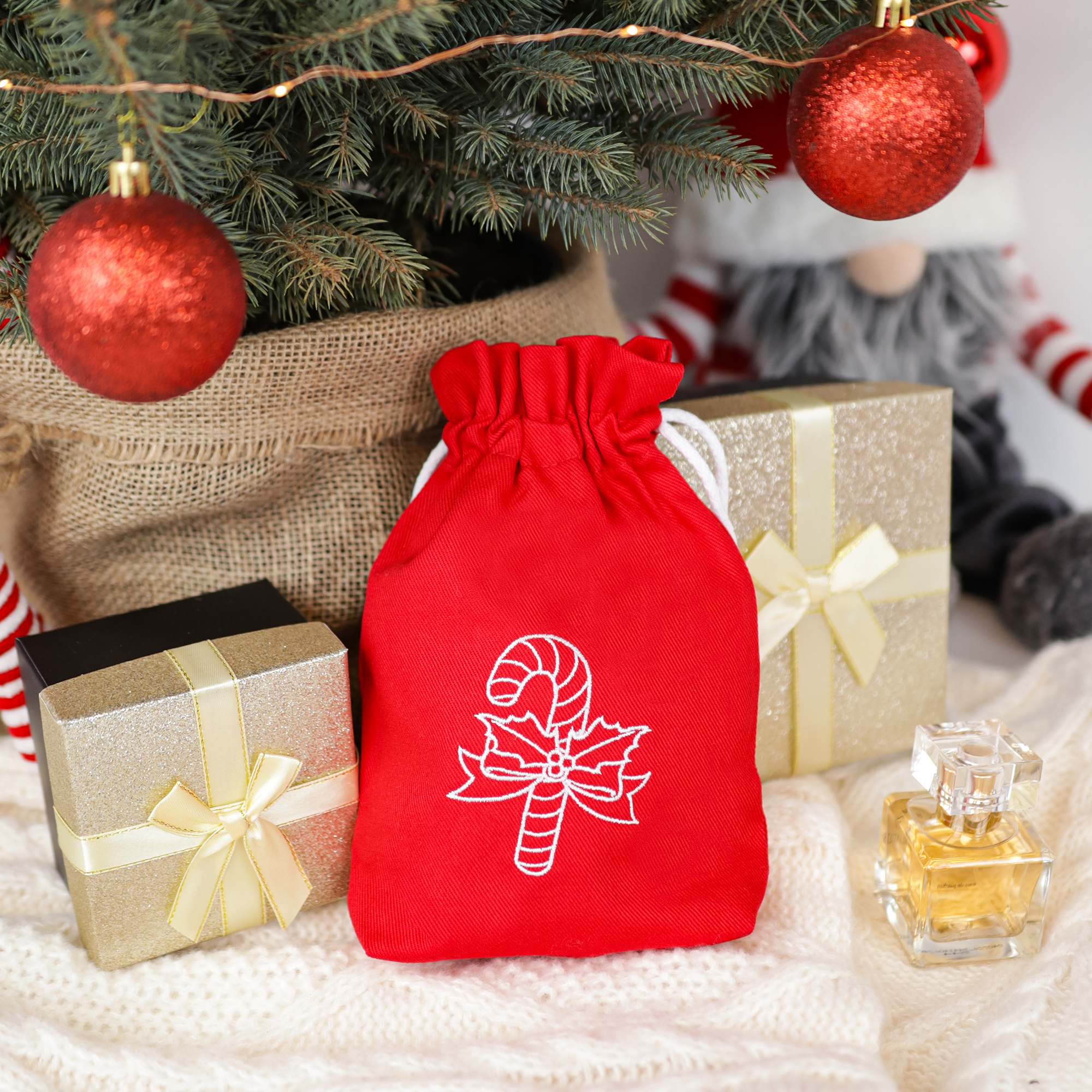 Bawełniany worek świąteczny w kolorze czerwonym z haftem – laska Mikołaja