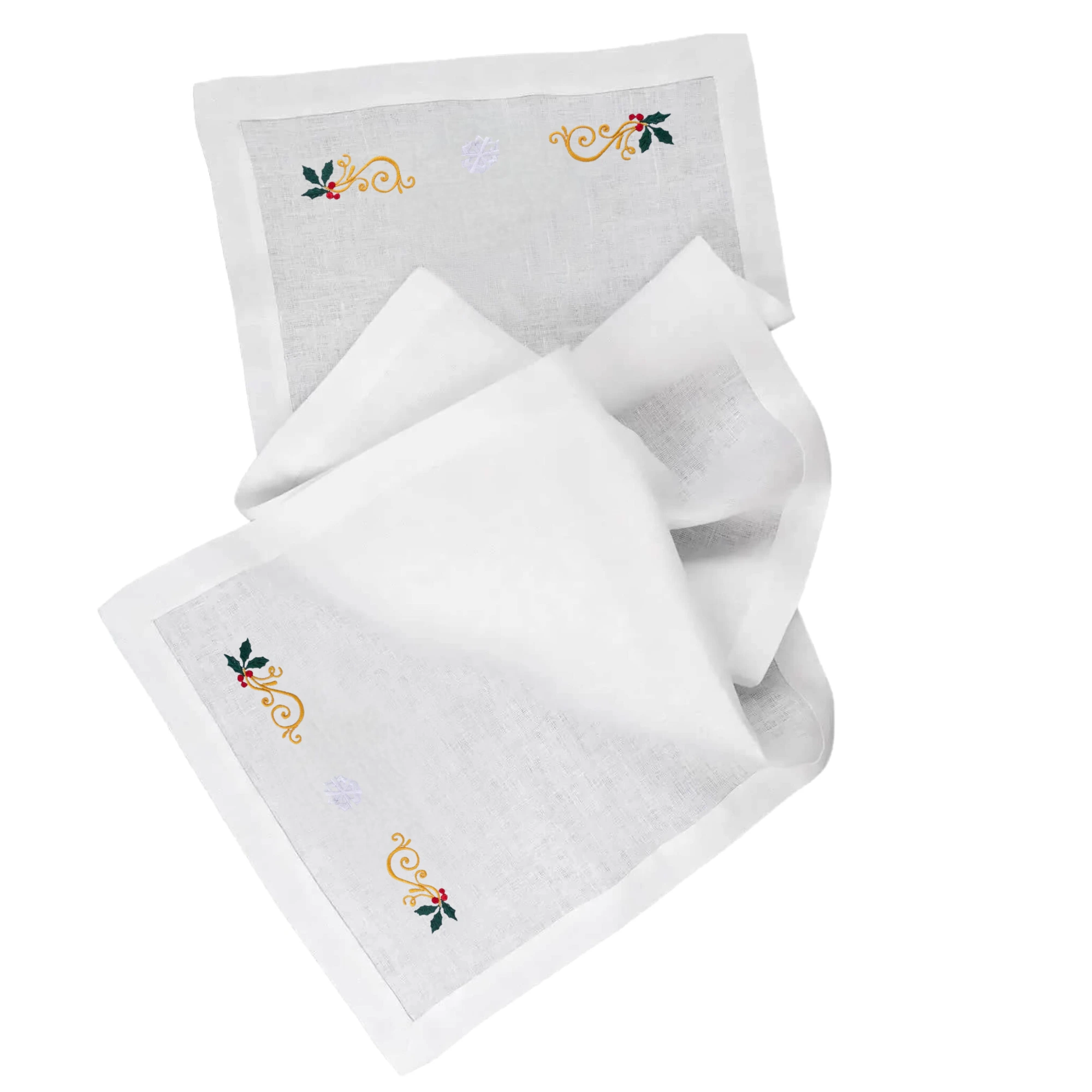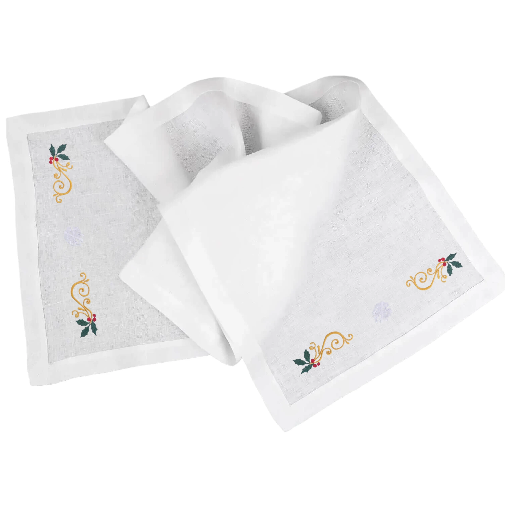 Motyw ostrokrzewu to klasyczny symbol Bożego Narodzenia. Zieleń jego liści i czerwień owoców od wieków oznaczają życie, nadzieję i radość. Wyhaftowany na białym lnie, tworzy subtelną, ale efektowną ozdobę stołu.