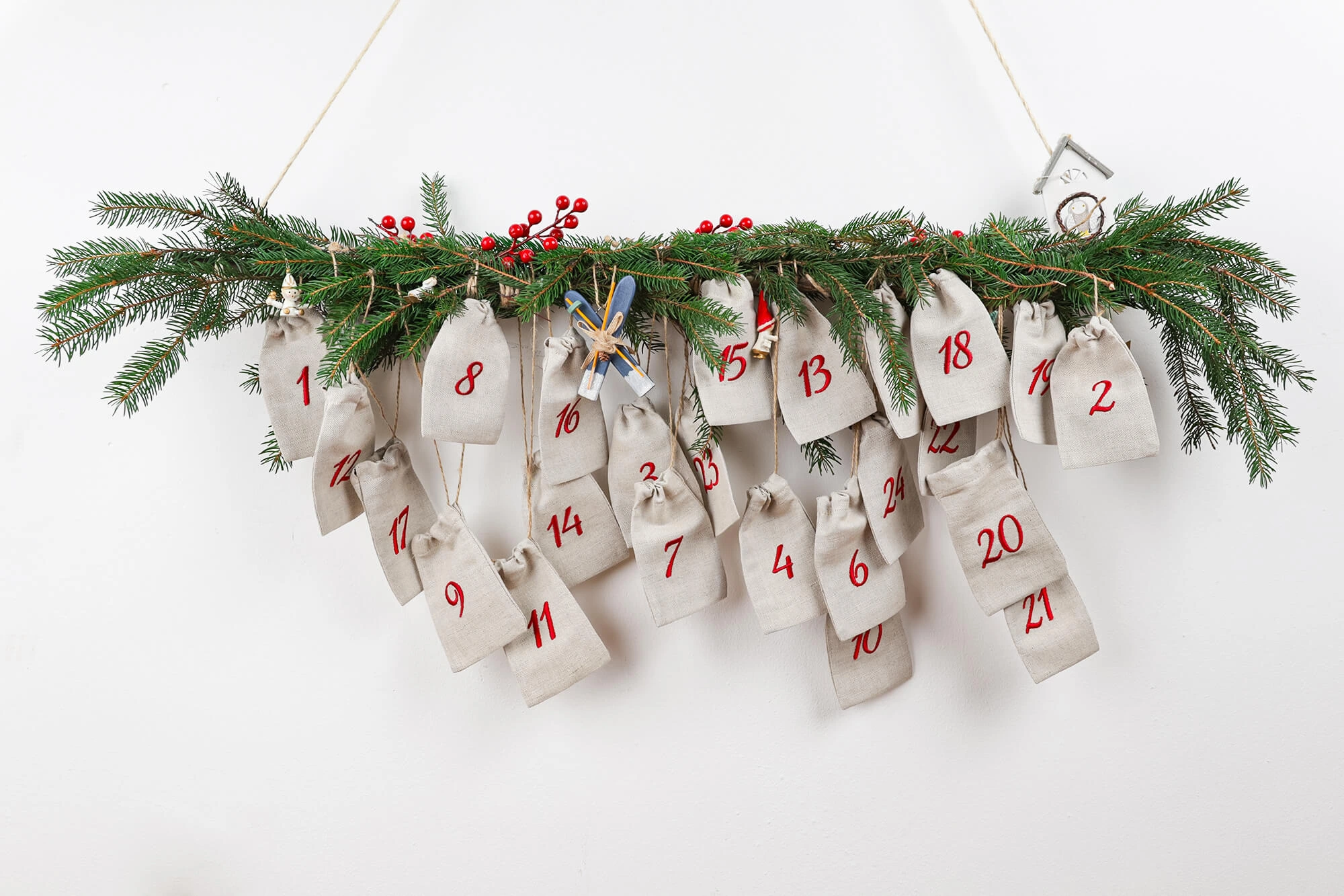 Lniane woreczki z numerami do kalendarza adwentowego diy – 24 woreczki haftowane