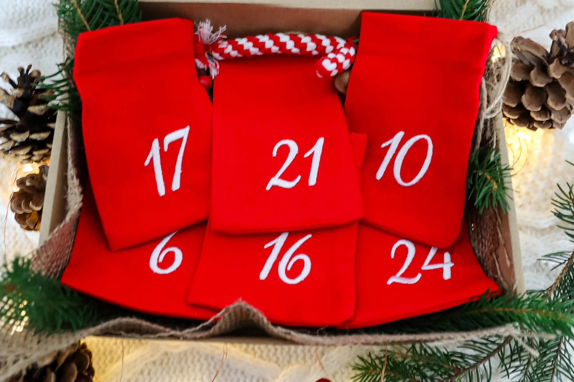 Zestaw zawiera 24 woreczki z haftowanymi numerami od 1 do 24, uszyte z naturalnych tkanin wysokiej jakości.Możesz wybrać wariant, który najlepiej pasuje do Twojego wnętrza i świątecznego stylu:
