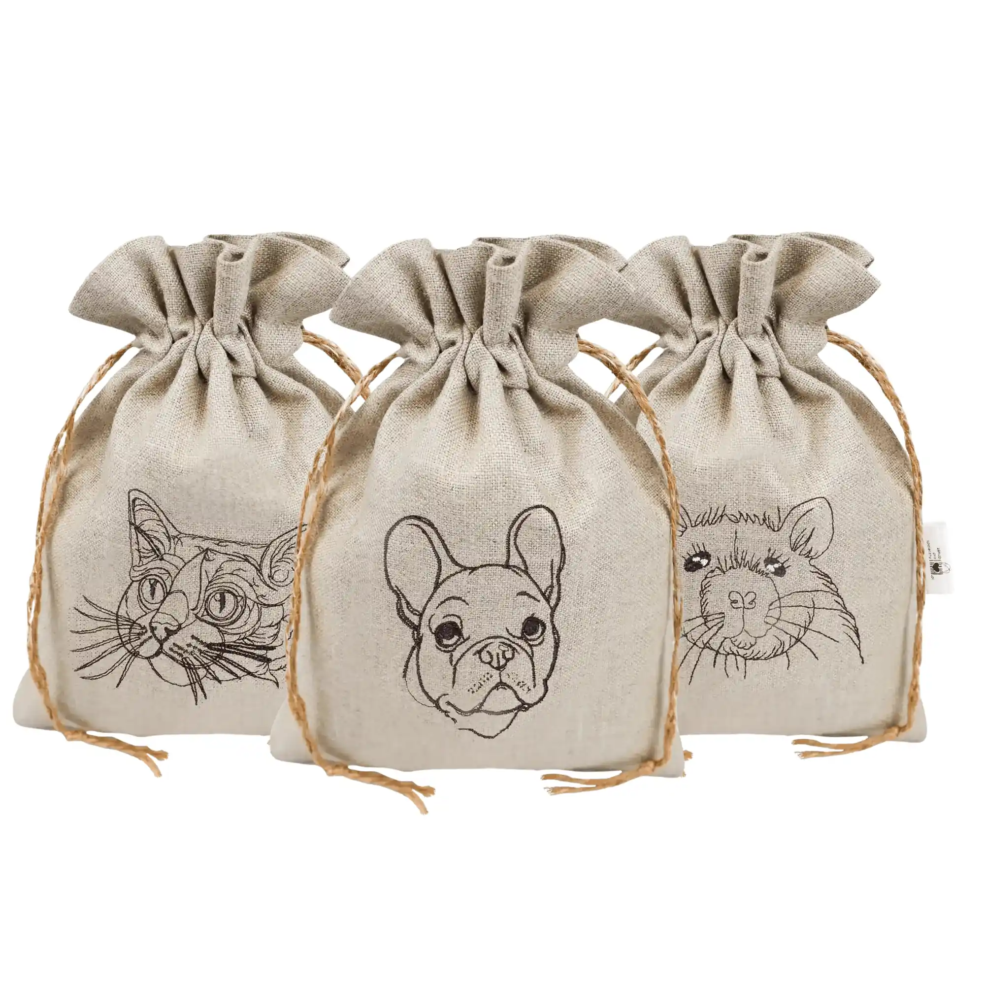 Zestaw lnianych woreczków dekoracyjnych z haftem – zwierzęta