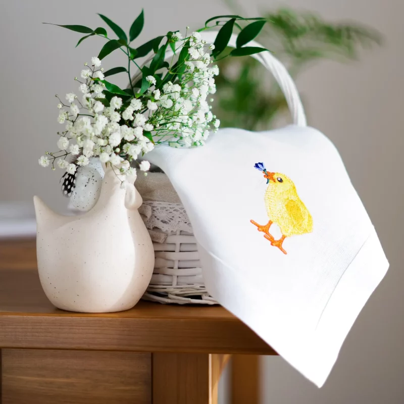 Małe serwety lniane do koszyczka wielkanocnego mają zarówno funkcję praktyczną, chroniąc zawartość, jak i estetyczną. Naturalna tkanina sprawdza się lepiej niż papierowe wkładki – jest trwalsza i nie absorbuje barwników z innych materiałów.